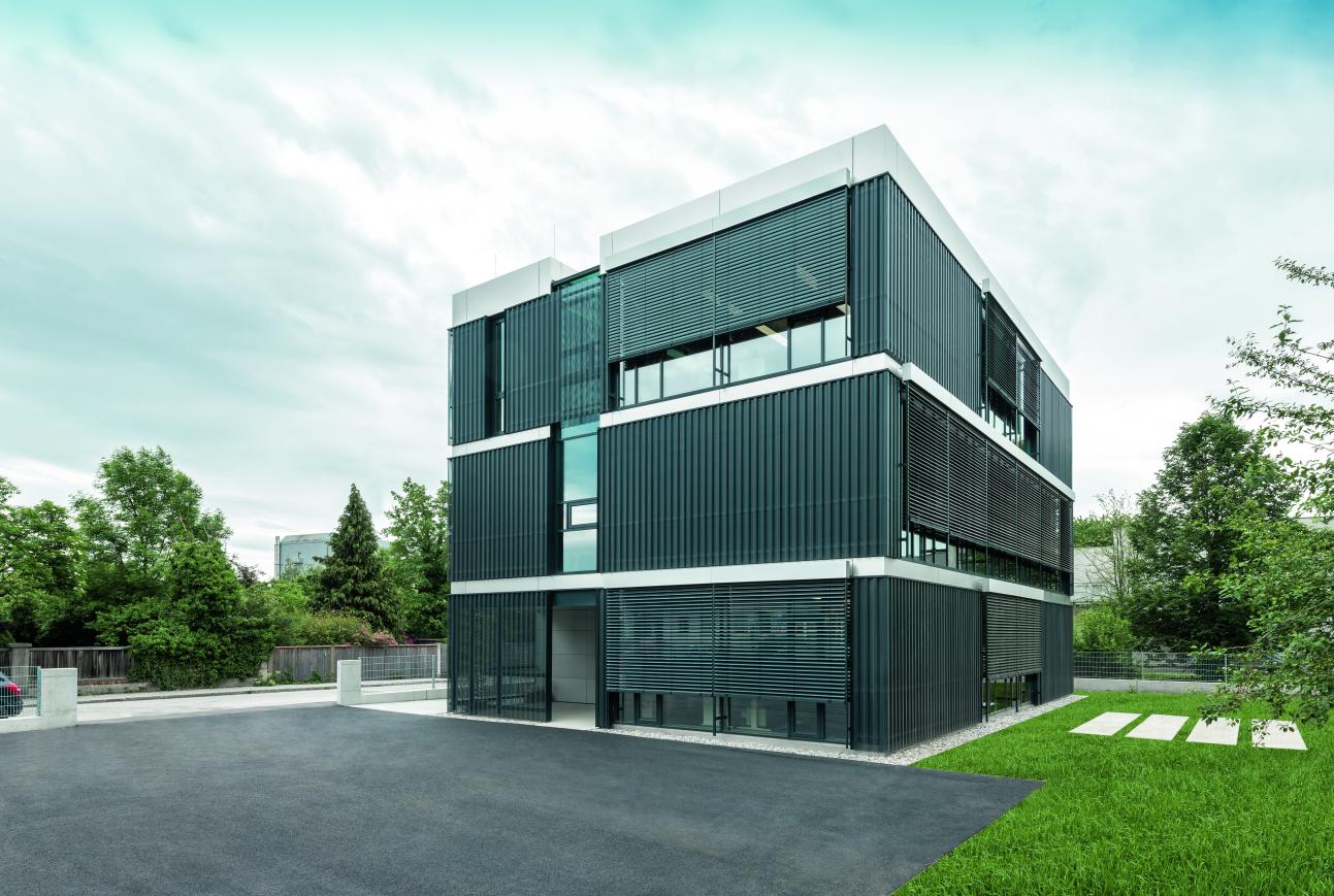 Raffstorenlamellen wirken herabgefahren sehr filigran und verleihen der Fassade eine pure und flache Optik.